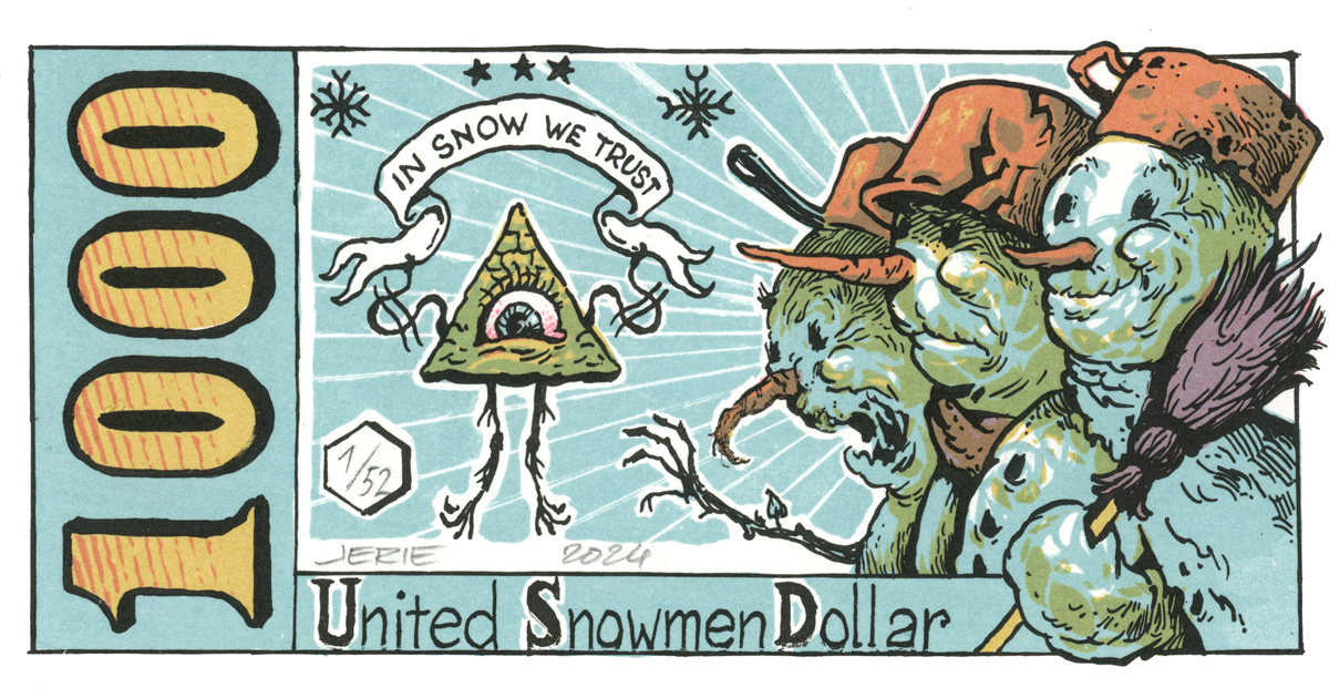 (V ceně jsou zahrnuté stylové desky s komiksem odhalujícím pravdu o celosvětovém finančním spiknutí sněhuláků a vlastnoručním podpis Lorda Dark Wintera a jeho pečetí.)