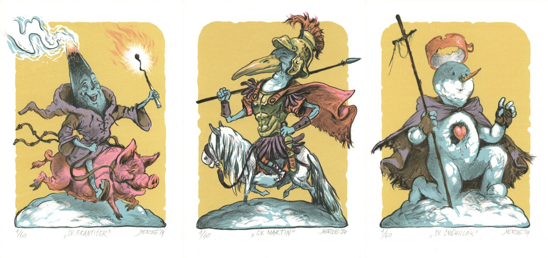 Zimní Triptych - Sv. František, Sv. Martin, Sv. Sněhulák, 3 x (29,7 x 21 cm), litografie, 2024